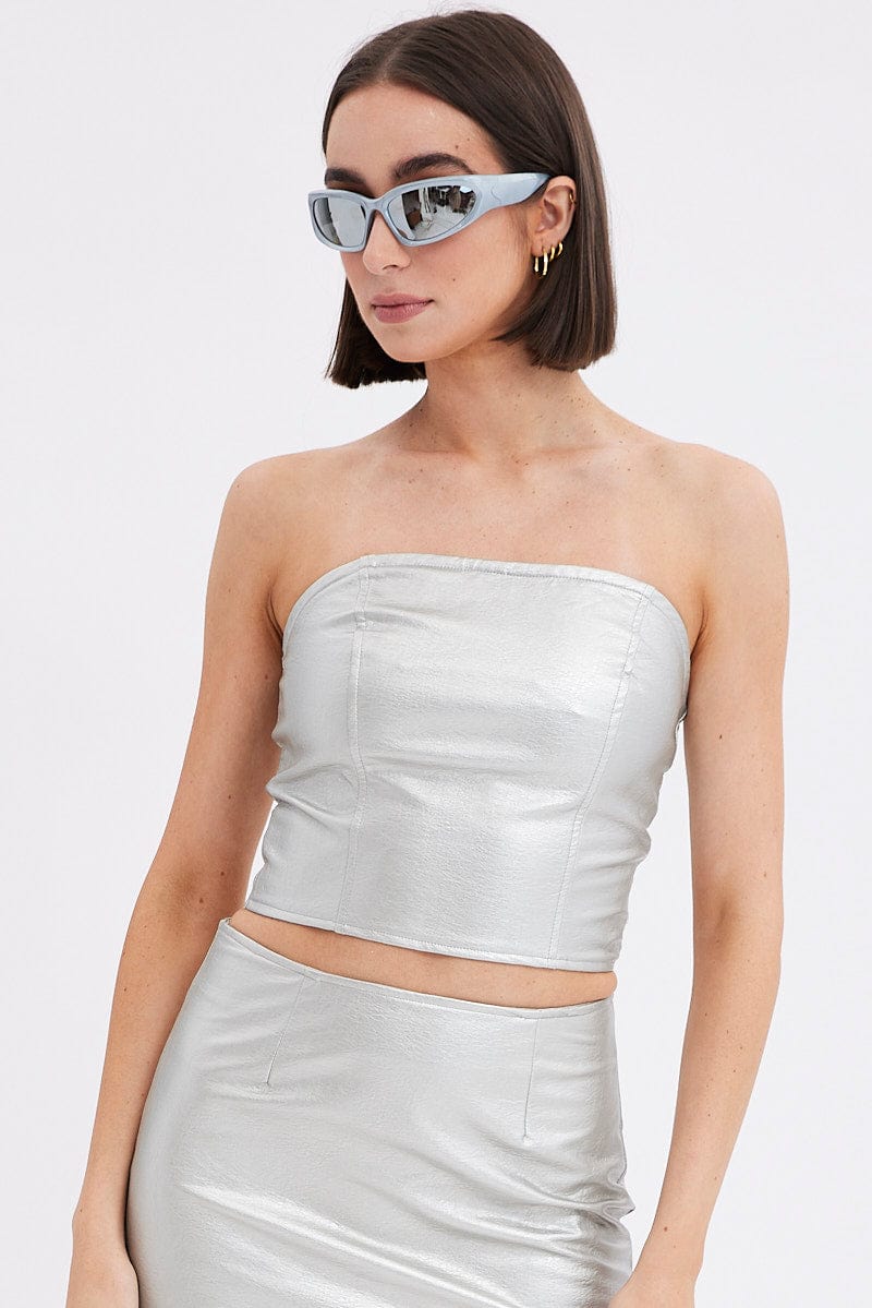 Metallic Corset Top Sleeveless Strapless Bandeau PU Silver