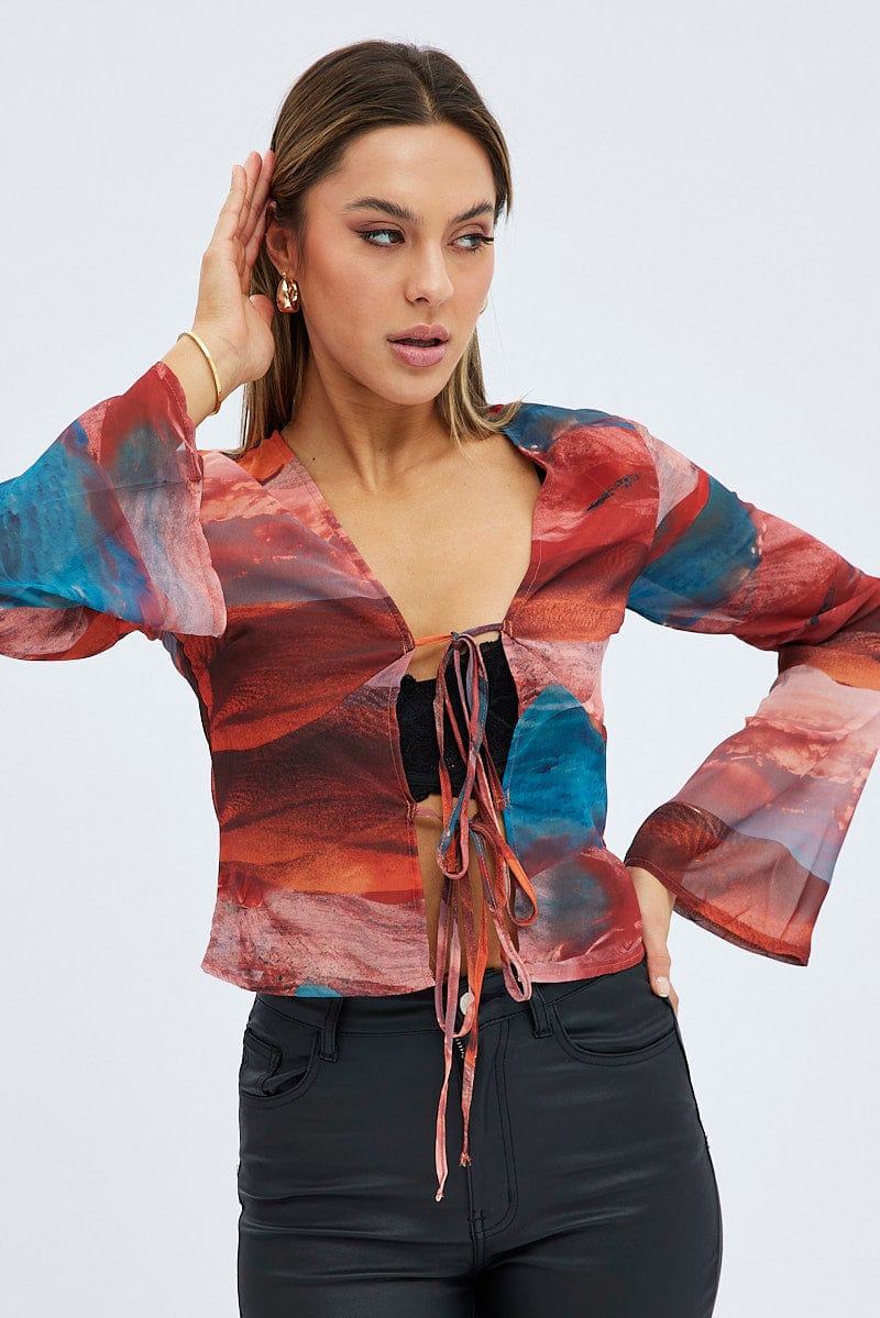 Multi Abstract Top Long Sleeve V-Neck Tie Front