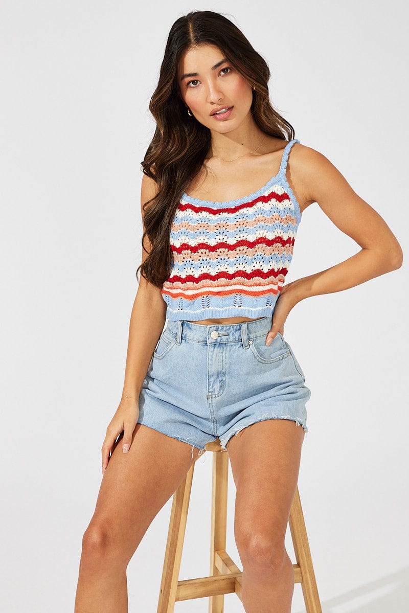 Orange Stripe Knit Singlet Sleeveless Scoop Neck Crochet