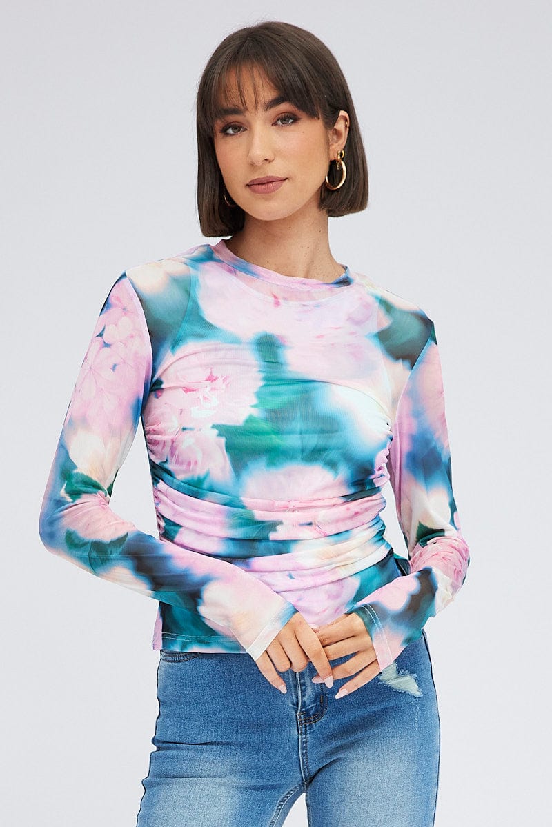 Pink Abstract Top Long Sleeve Crew Neck Longline Ruched Mesh