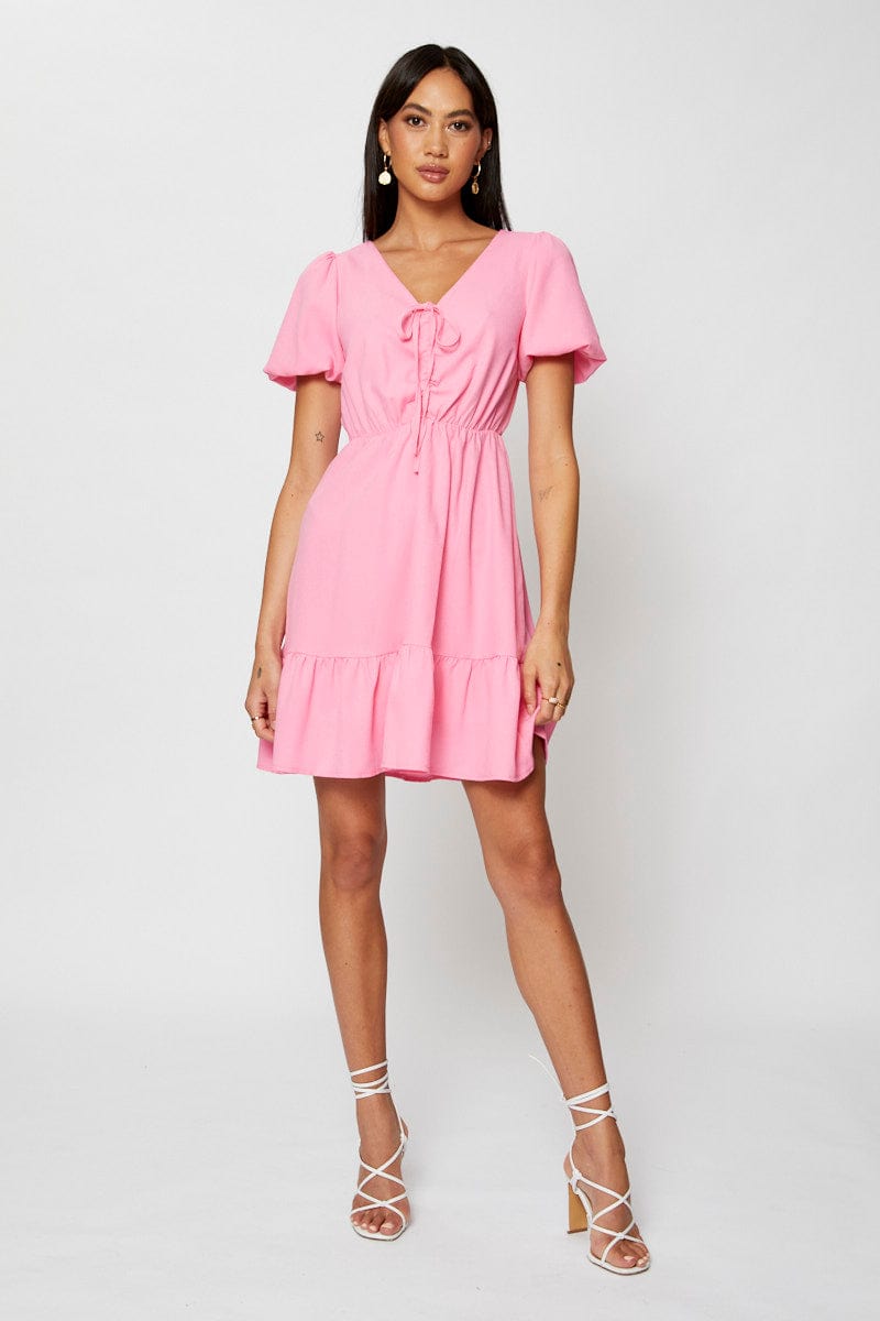 Pink Fit And Flare Dress Short Sleeve V Neck