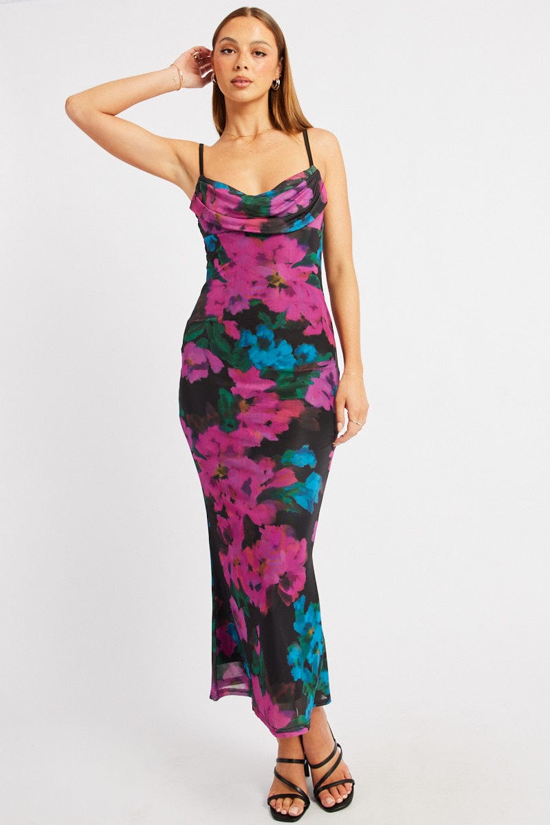 Pink Floral Bodycon Dress Singlet Cowl Neck Maxi