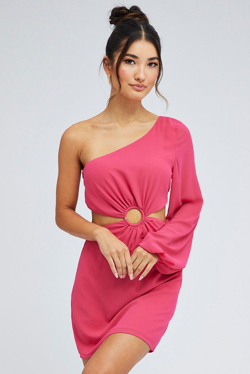 Pink Fuchsia One Shoulder Ring Detail Dress