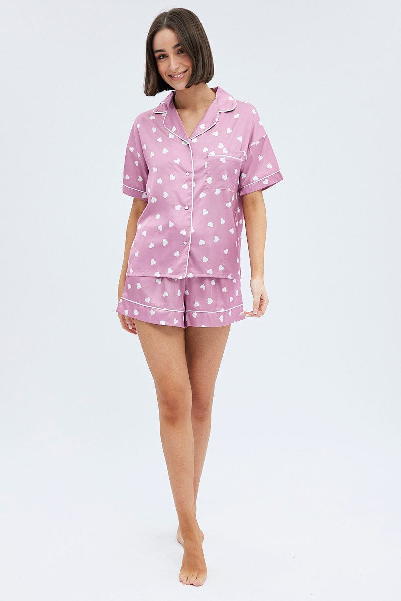 Pink Polka Dot Pink Satin Hearts Contrast Piping Pyjama Set