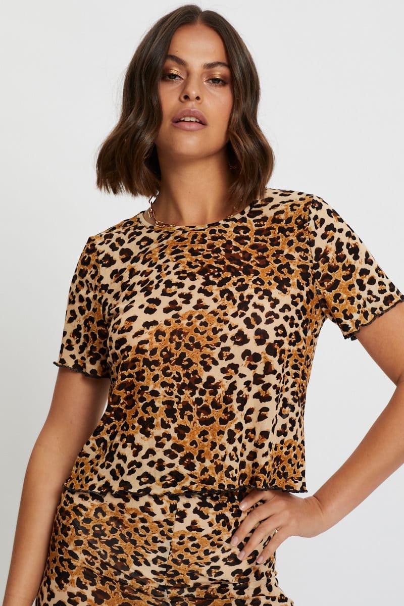 - Mesh Material, Animal Print, Frill Hem, Cropped Length