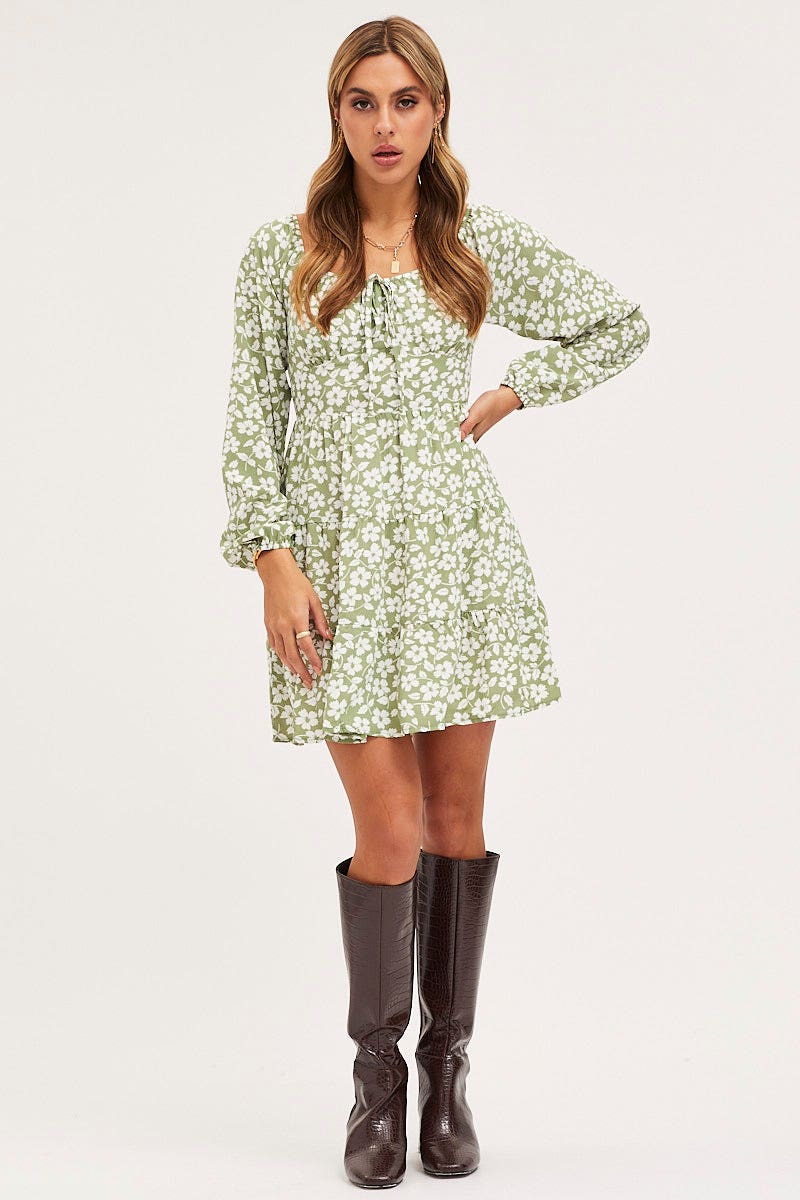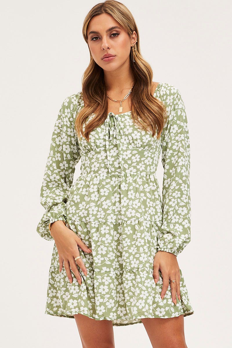 - Tiered Design, Floral Print, Tie Detail, Long Sleeves