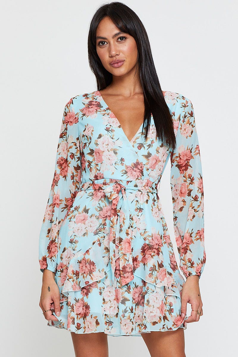 Print Mini Dress Long Sleeve V Neck
