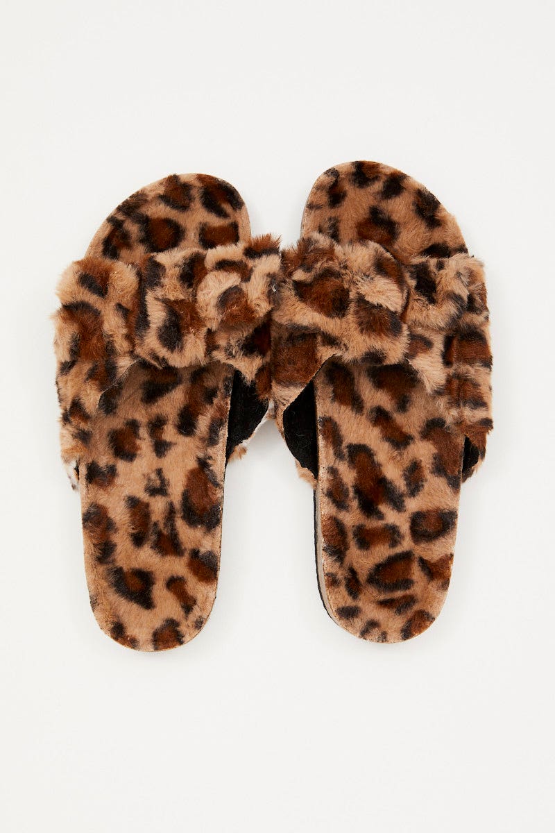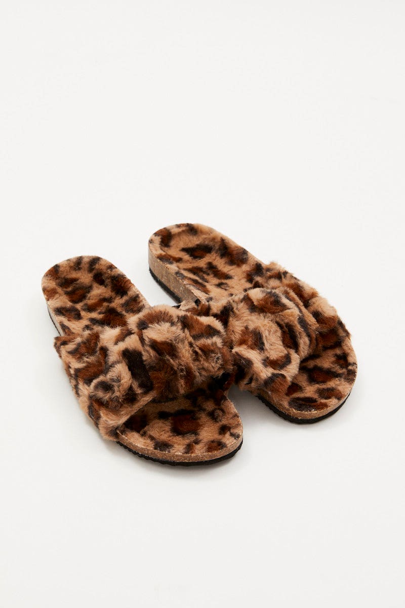 Print Plush Faux Fur Leopard Bow Detail Slippers