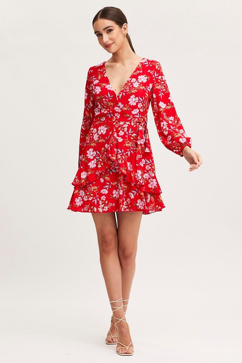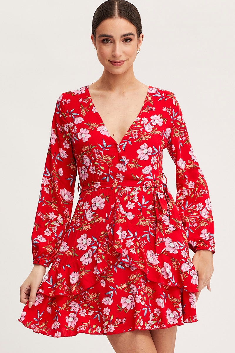 - Floral Print, Wrap Design, Waist Tie, Ruffle Hem