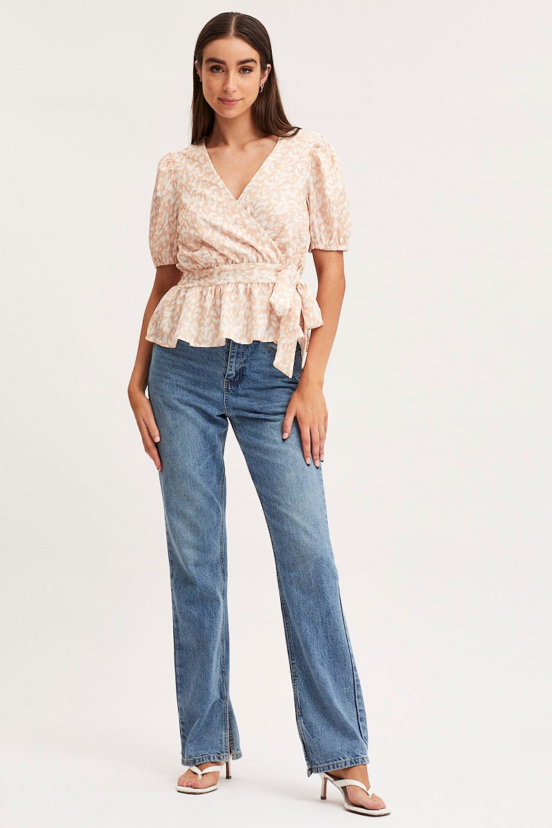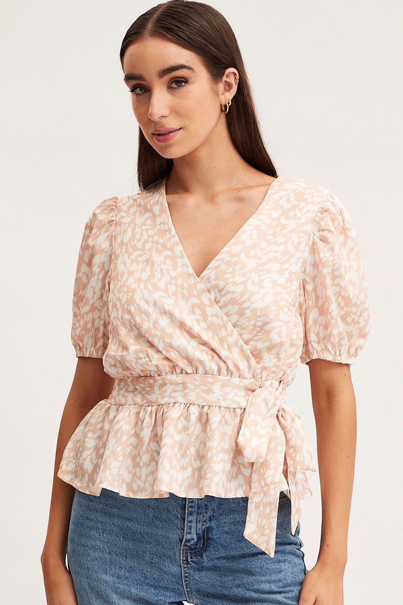 - Geo Print, Puff Sleeves, Tie Detail, Wrap Front