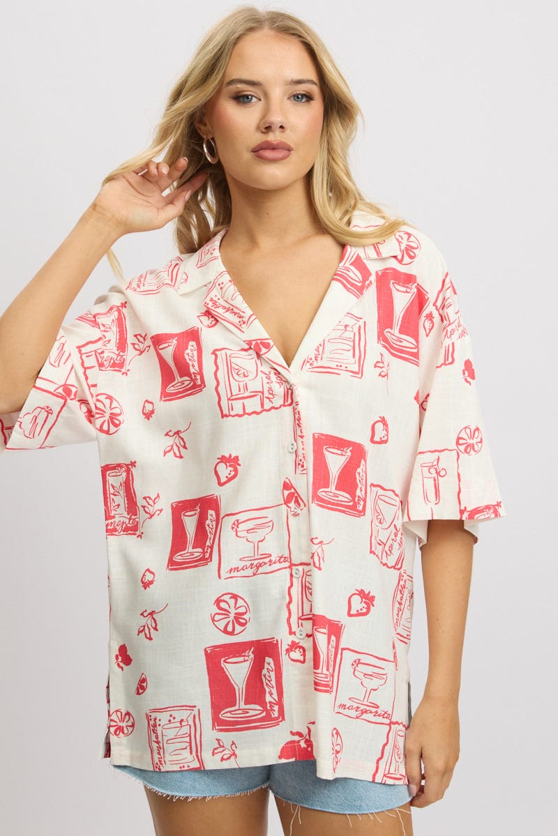 Red Abstract Relaxed Shirt Short Sleeve Linen Blend