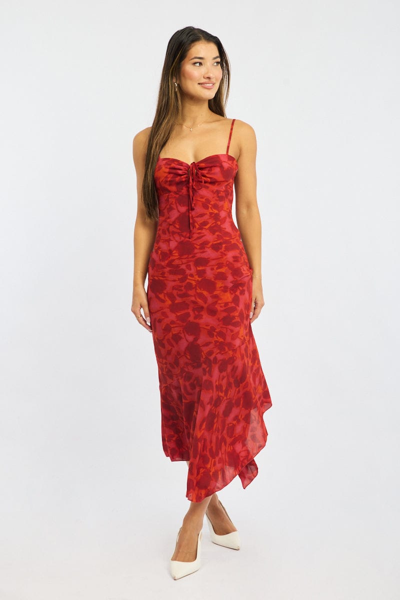 - Gathered Bust, Tie Detail, Asymmetrical Hem, Lined