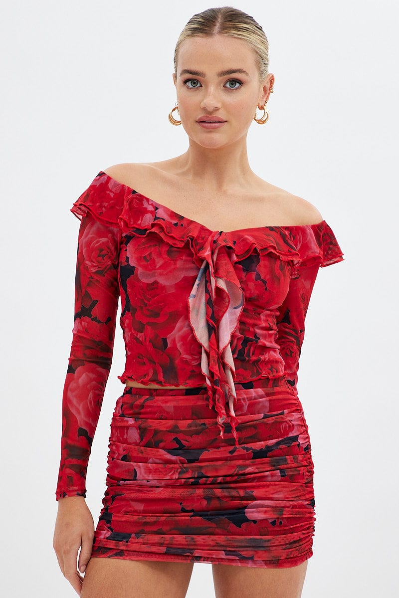 Red Floral Mini Skirt Side Ruched Mid Rise Mesh