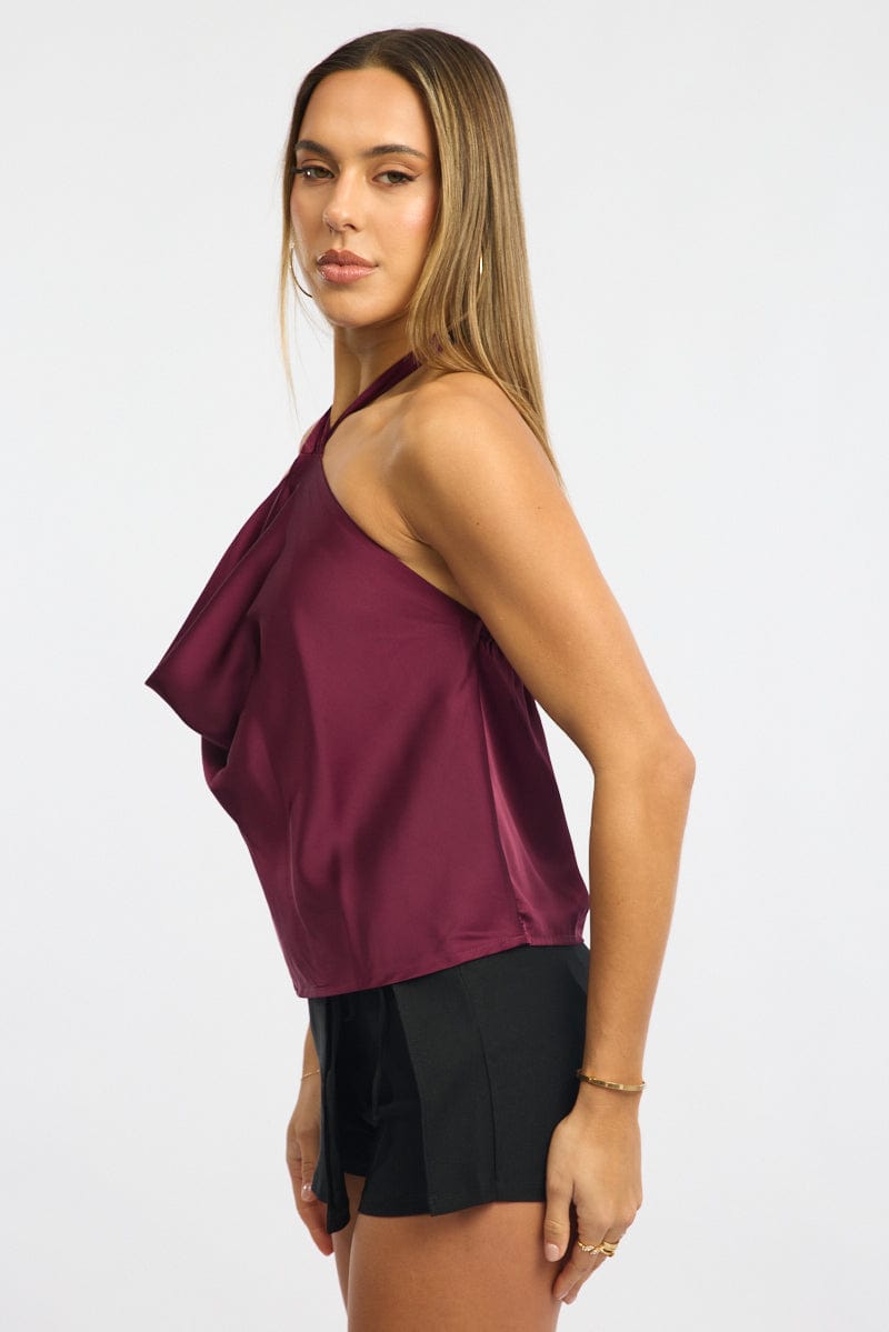 - Cowl Neck Front, Backless, Halter Neck Tie, Elasticated Back Trim
