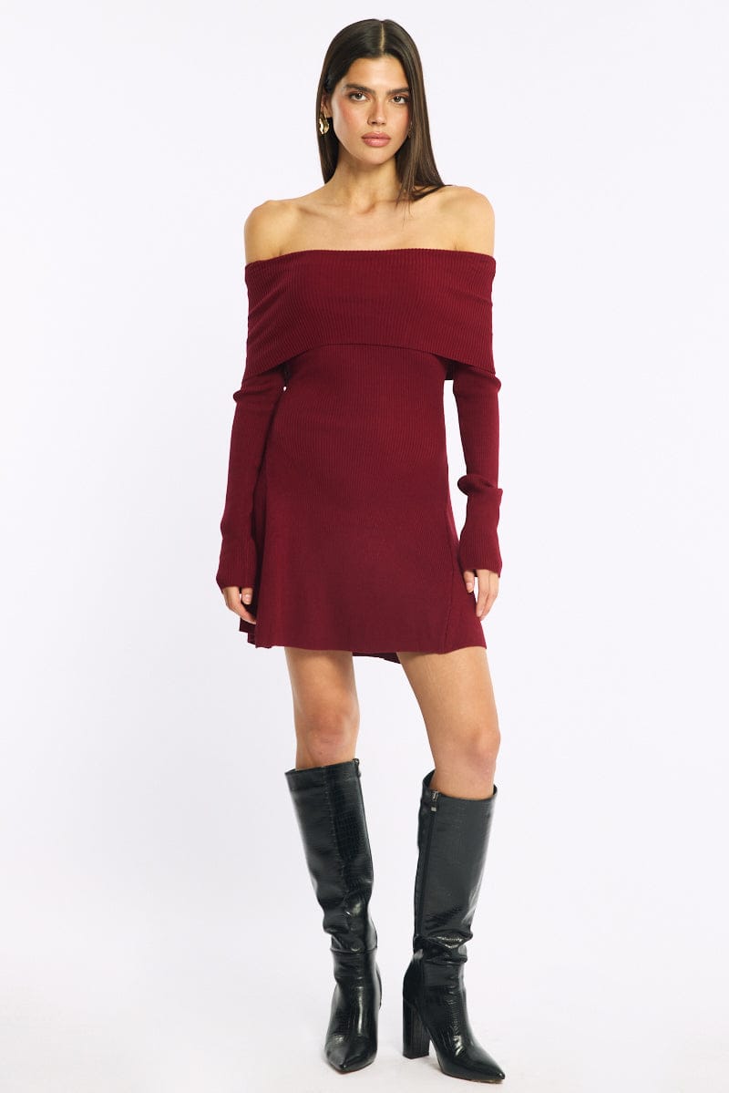 Red Knit Dress Long Sleeve Off Shoulder