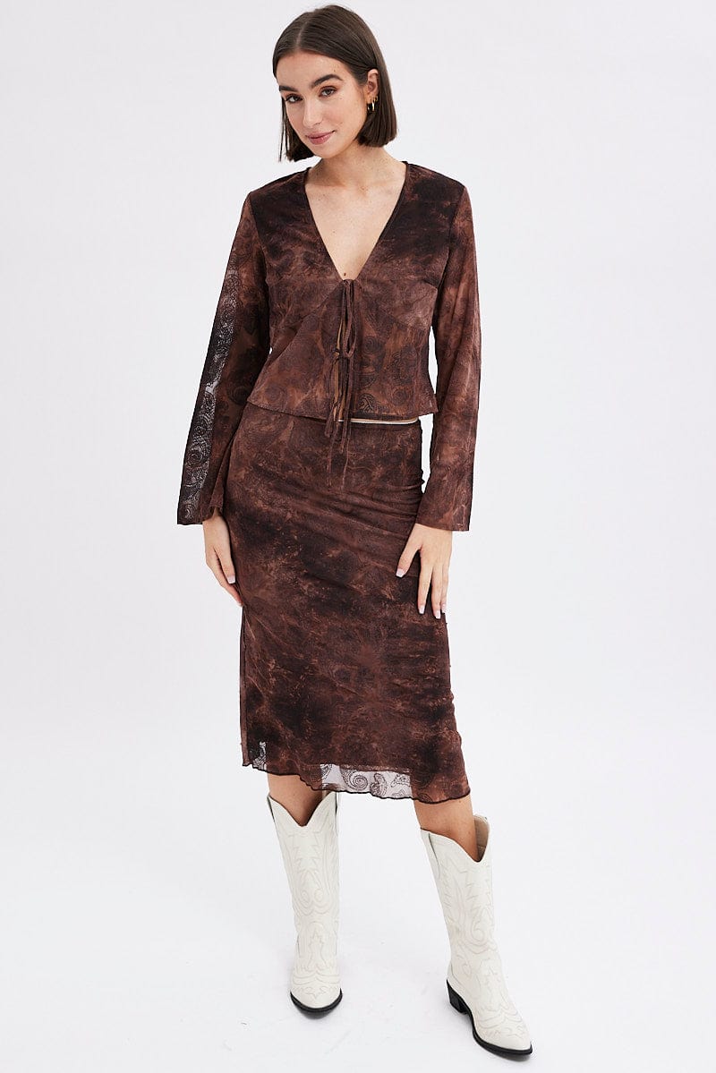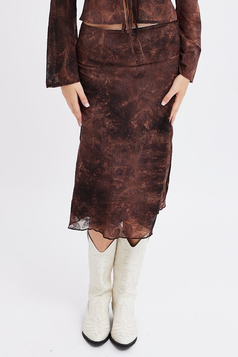 Red Paisley Midi Skirt High Rise Fit & Flare Mesh Lined