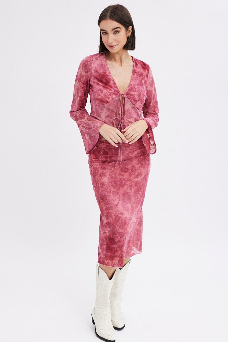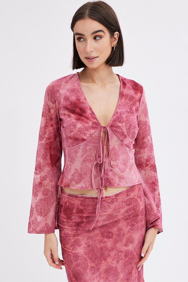 Red Paisley Tie Front Top Long Sleeve V Neck Mesh Flocked