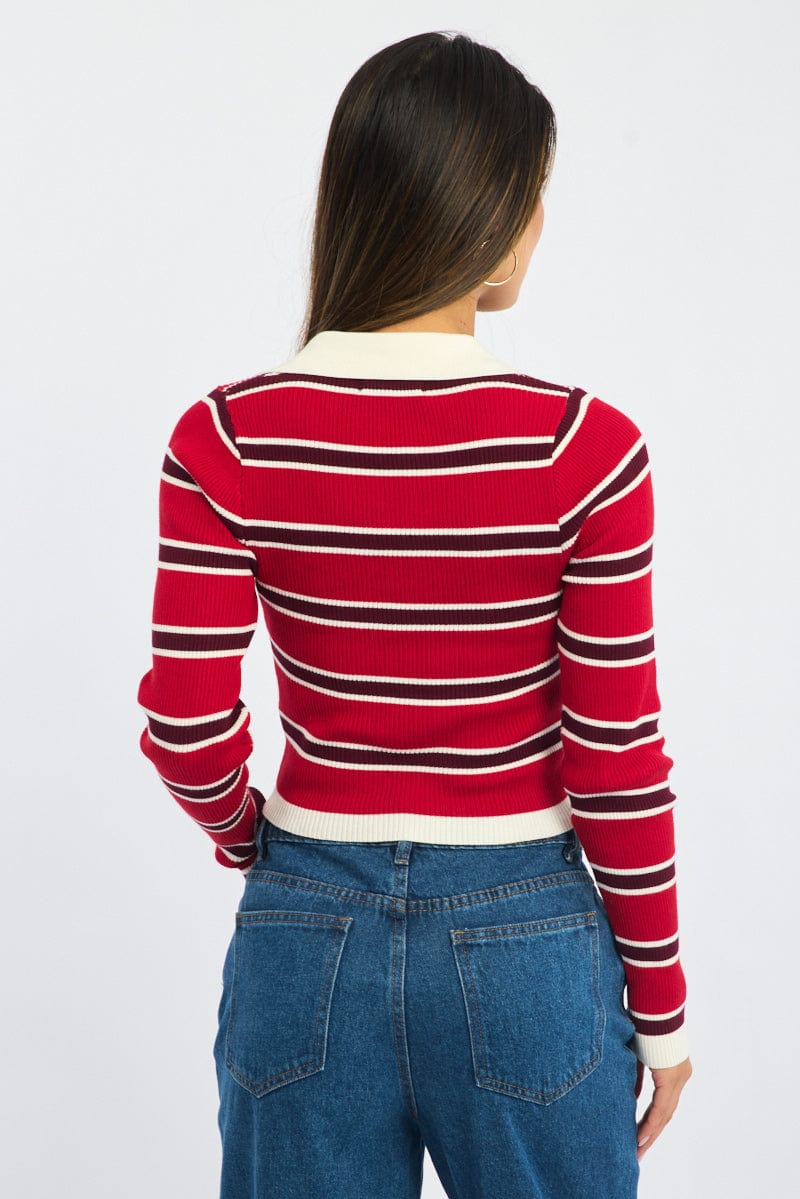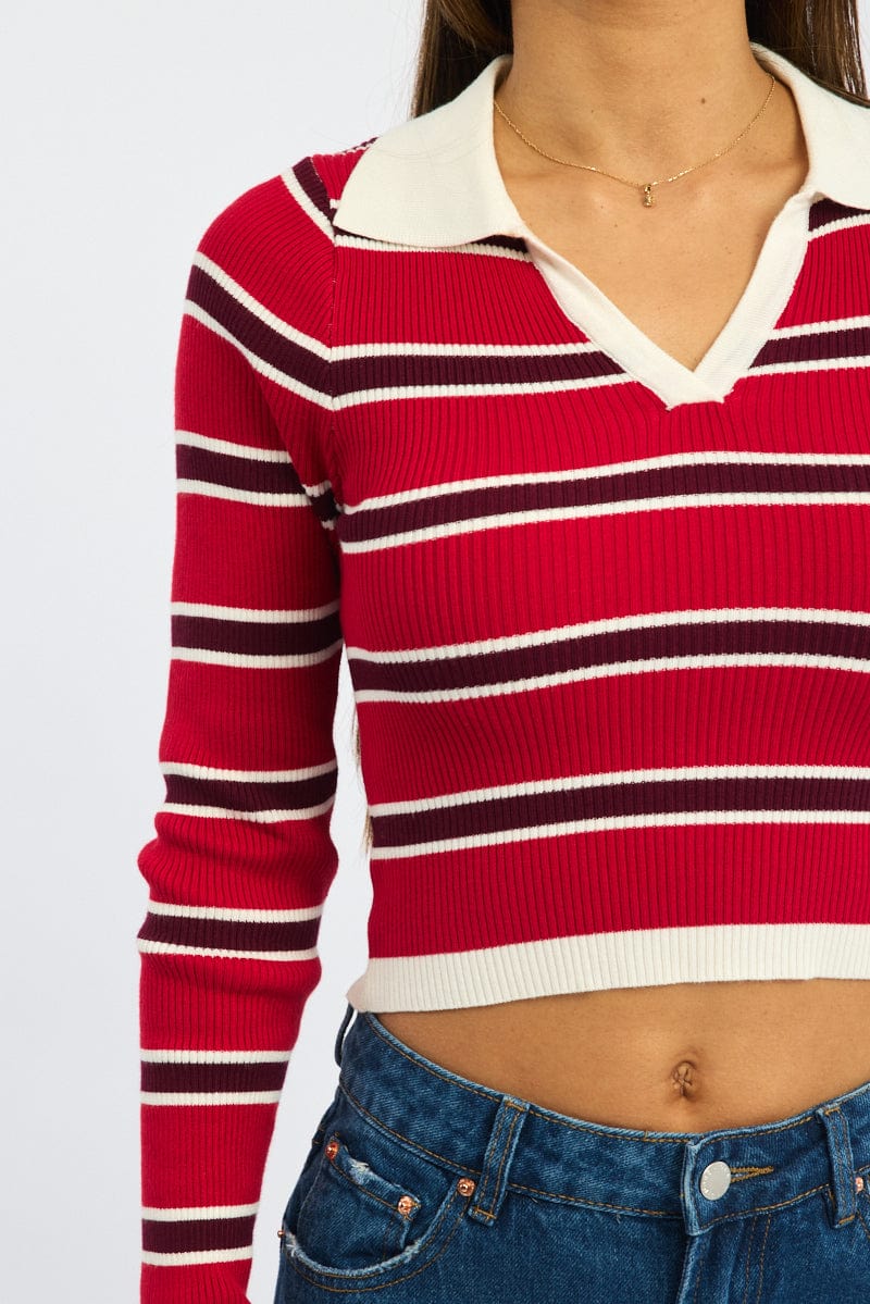 Red Stripe Knit Top Long Sleeve Collar