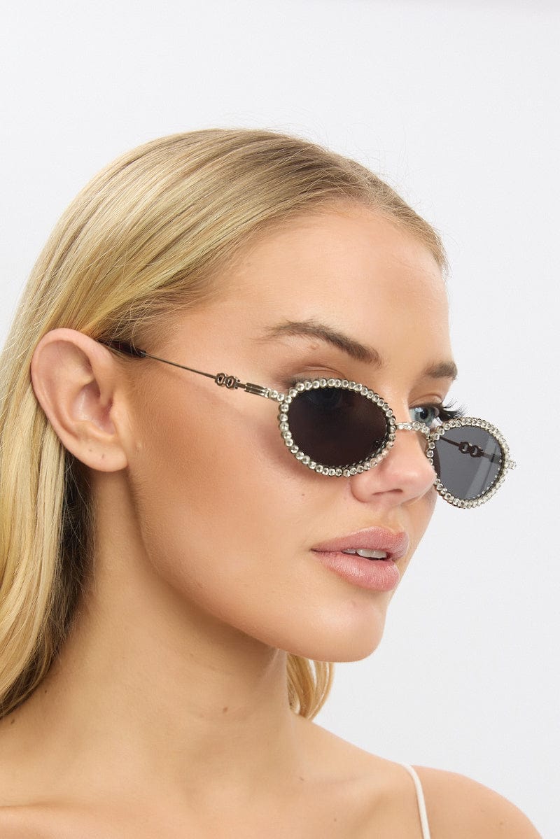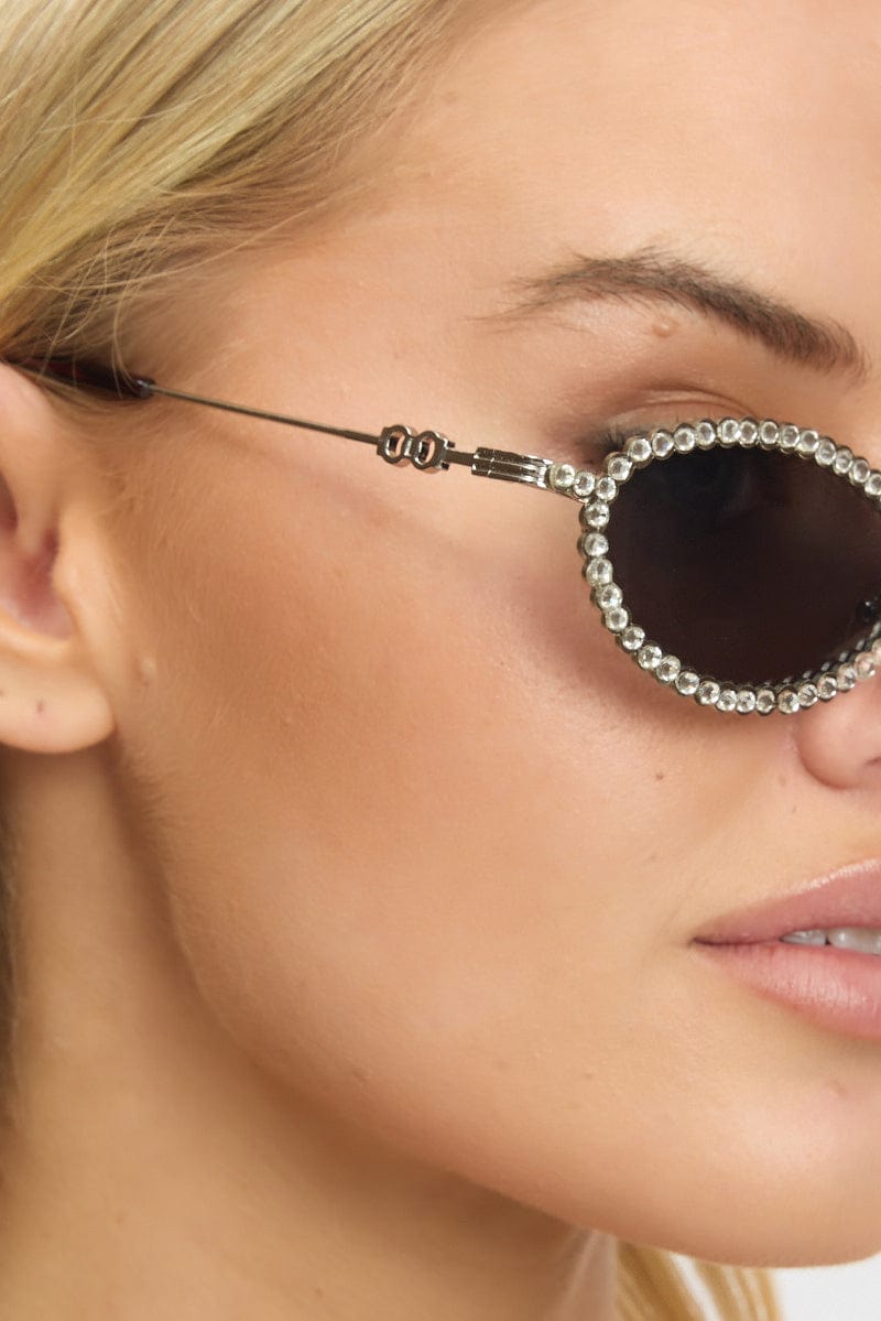 - Oval Shape, Rhinestone Border, Black Tinted Lens, Silver Hardware