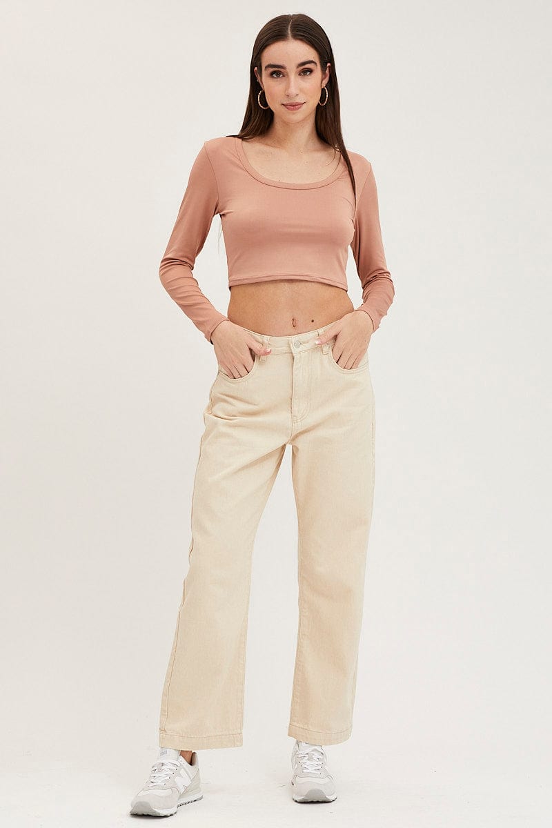 Taupe Crop Top Smooth Long Sleeve Scoop Neck