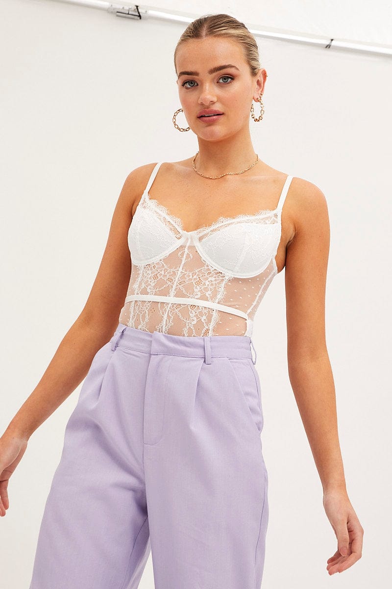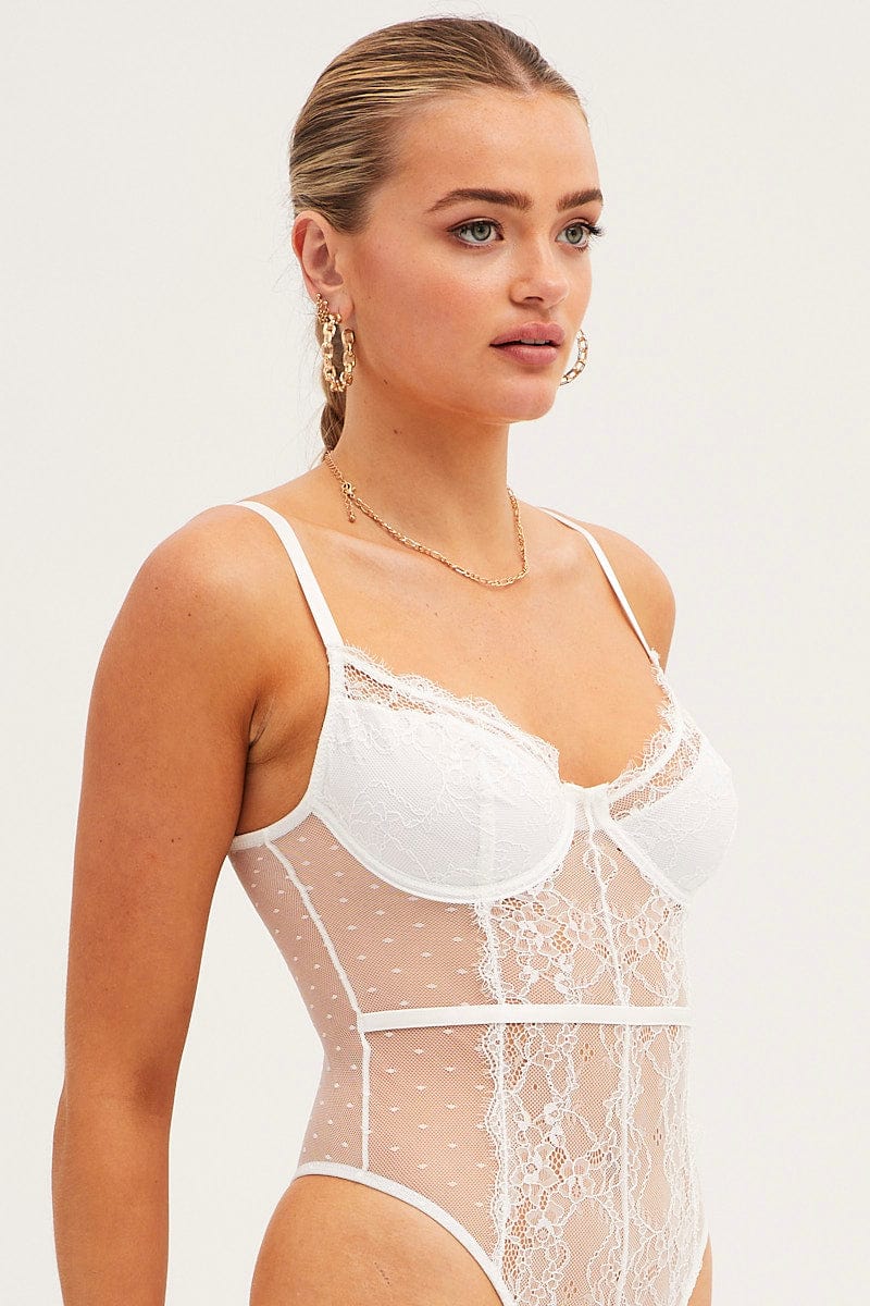White Bodysuit Sleeveless Sweetheart Lace Jersey