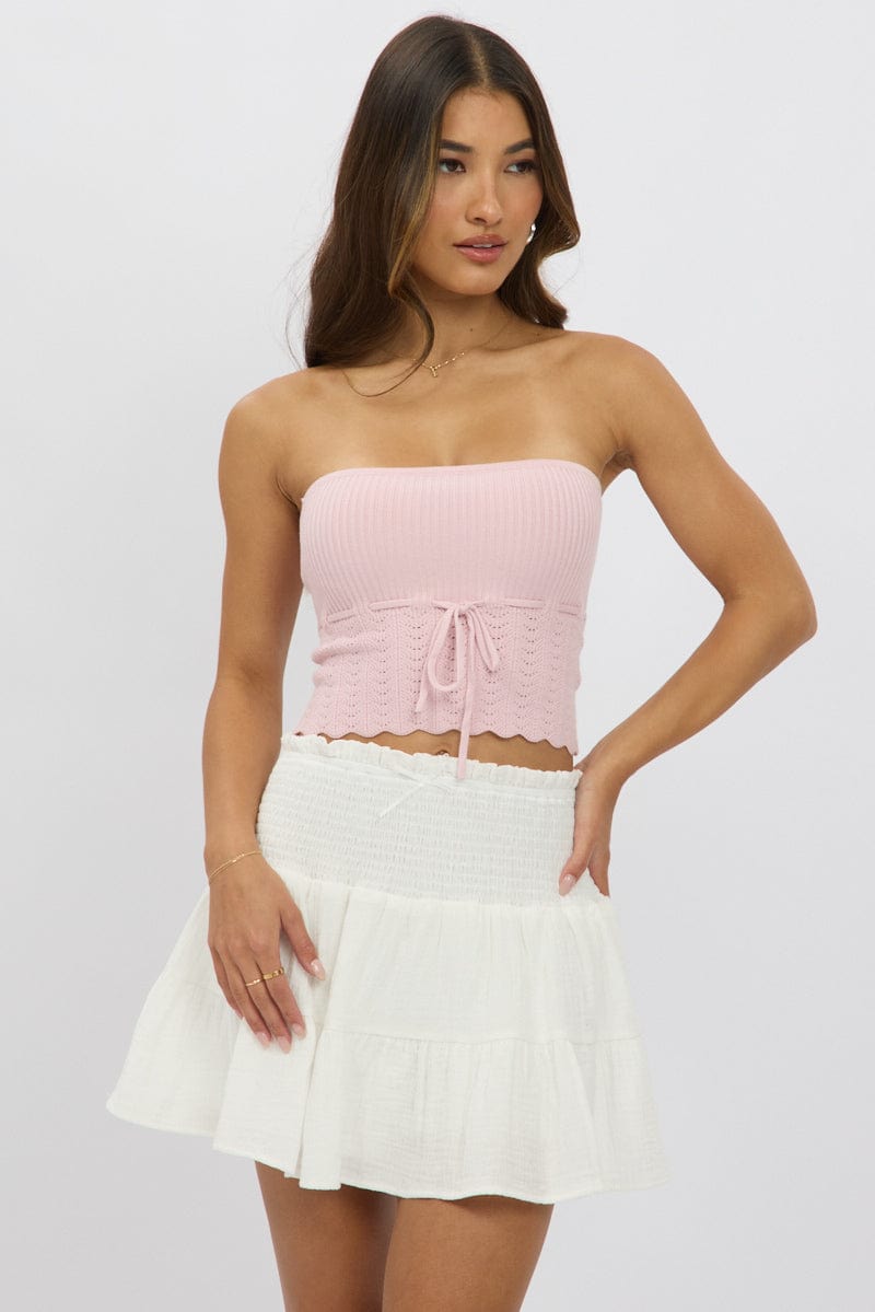 White Mini Skort Skirt Shirred Waist Cotton Textured Lined