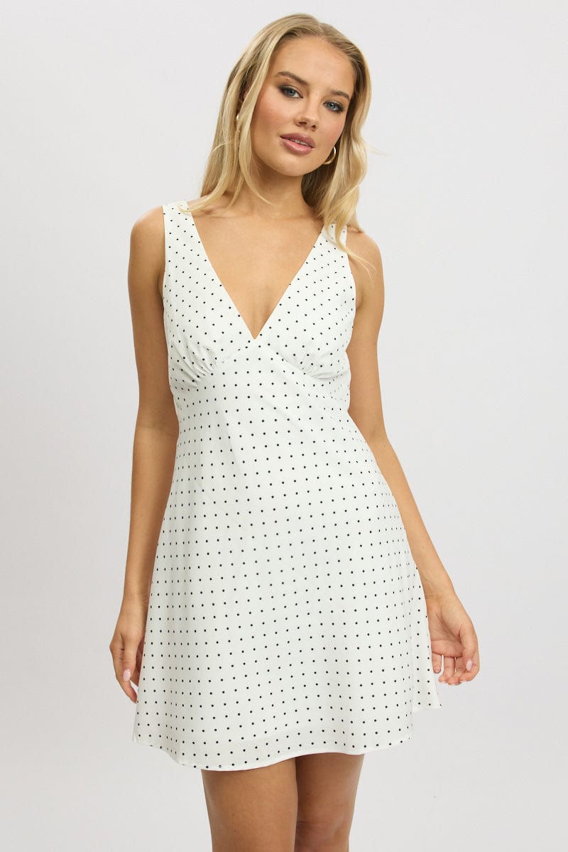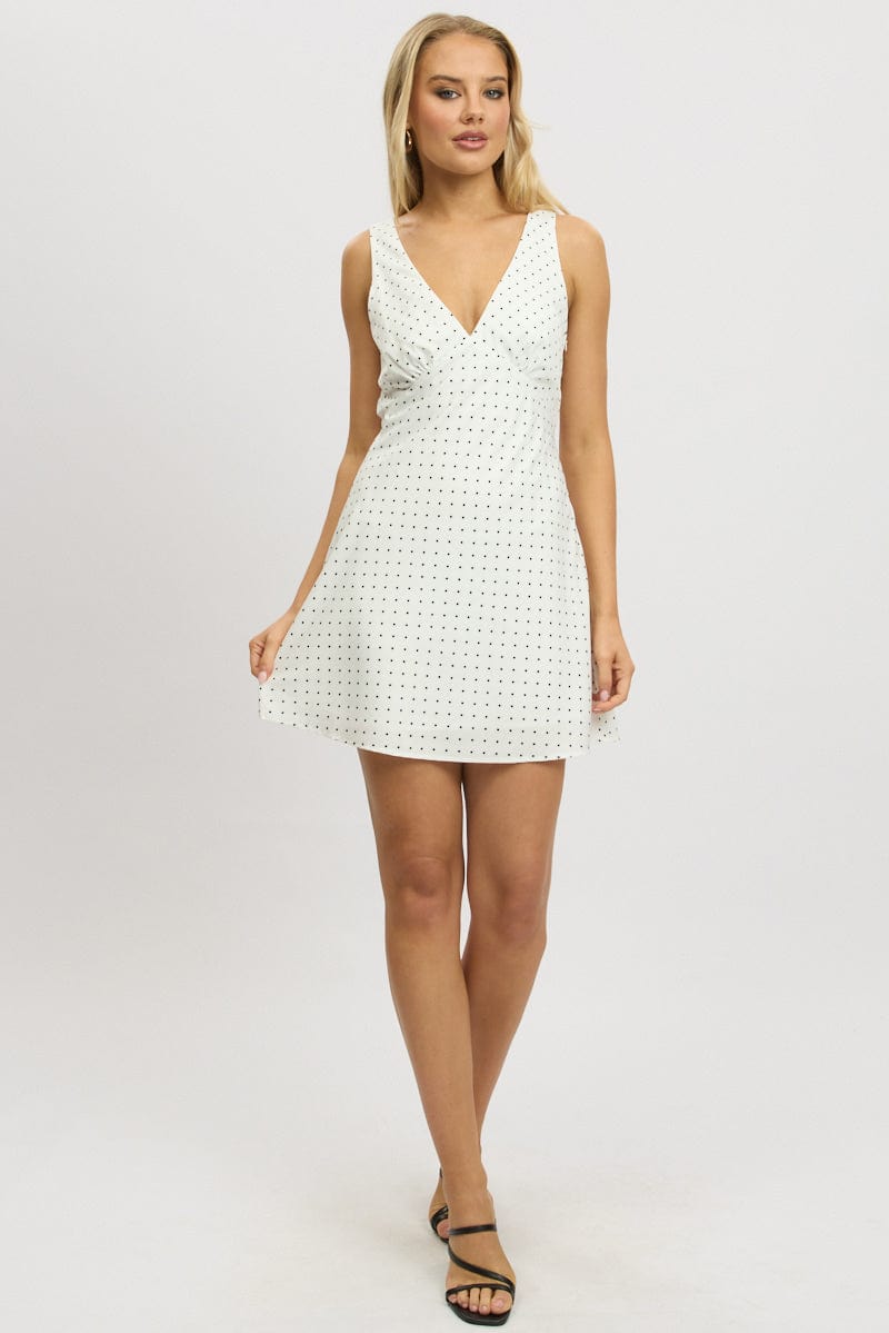 White Polka Dot A Line Mini Dress Sleeveless