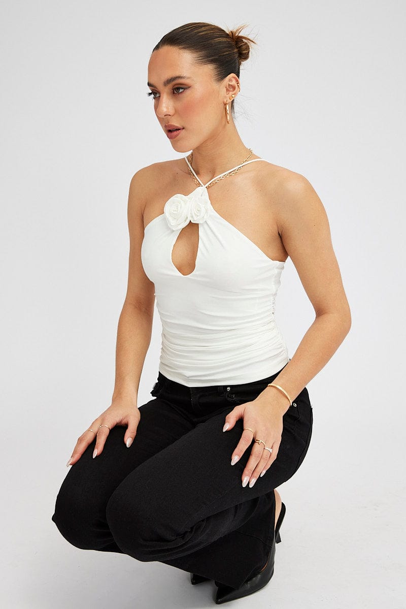 White Rose Top Halter Neck Crossover Rosette Stretch