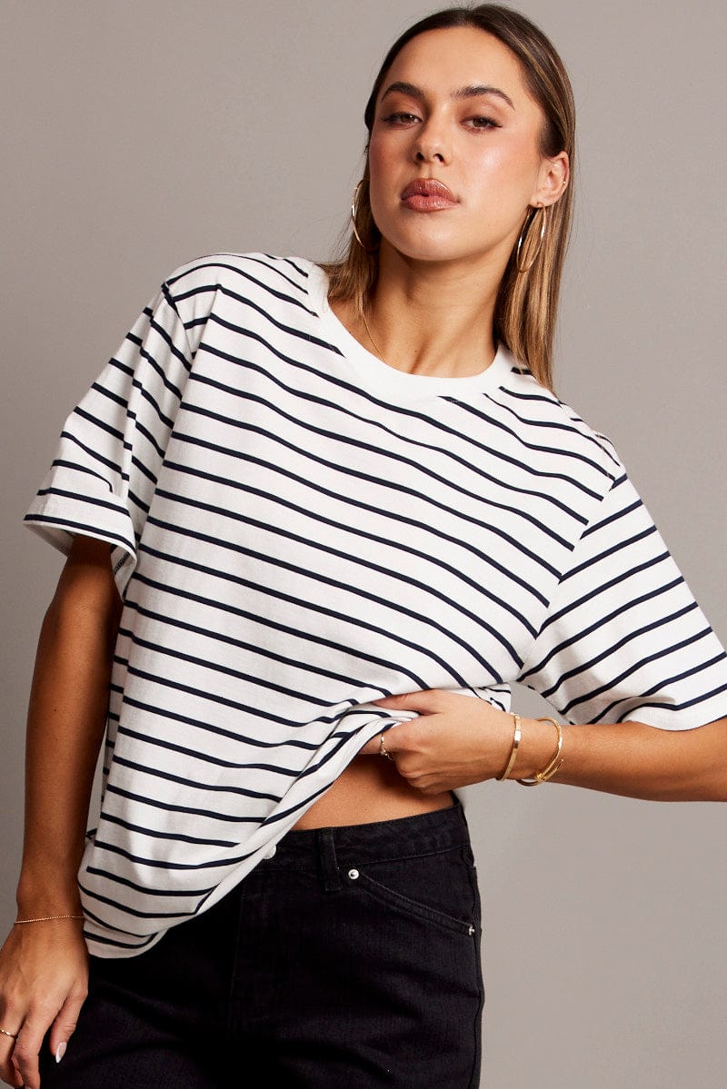 White Stripe Oversized T Shirt Short Sleeve Crew Neck
