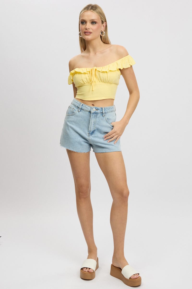 Yellow Crop Top Ruffle Off Shoulder Linen Blend